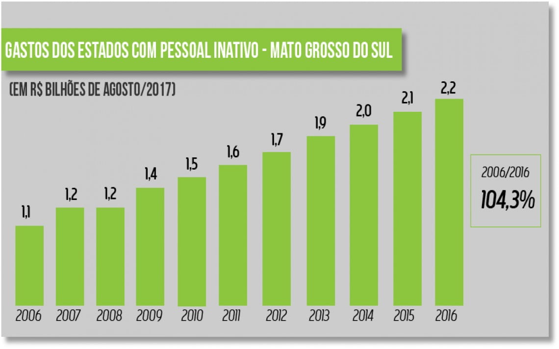 Os gastos com previdência em Mato Grosso do Sul têm registrado crescimento bastante acelerado nos últimos anos. De 2006 a 2016, por exemplo, o avanço nas despesas foi de 104,3%. Por conta disso, o déficit mensal passa de R$ 80 milhões e as contas devem fechar o ano com rombo de R$ 1 bilhão, segundo o governo do estado.