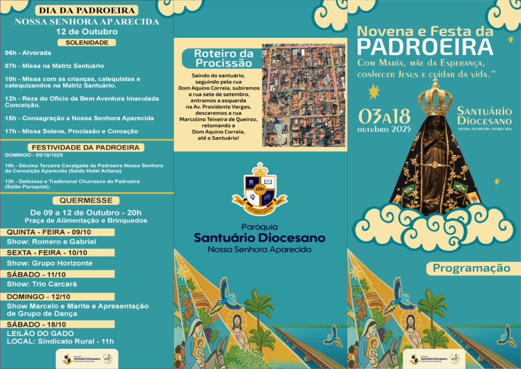 Aparecida do Taboado (MS) – A Paróquia Santuário Diocesano Nossa Senhora Aparecida divulgou a programação da Festa da Padroeira, que contará com atividades religiosas, procissão, cavalgada, quermesse e leilão de gado.