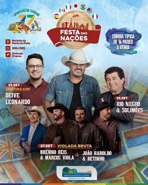 O município de Aparecida do Taboado completa 77 anos de emancipação político-administrativa e prepara uma agenda comemorativa entre os dias 25 e 28 de setembro. As atividades incluem a tradicional Festa das Nações, com shows, gastronomia internacional e apresentações culturais, além do Desfile Cívico.