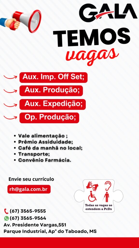 Aparecida do Taboado (MS) – Está em busca de uma oportunidade de emprego? O Costa Leste News reuniu algumas das vagas de emprego disponíveis nas indústrias Plastrela, Bello Alimentos, Eucapinus e GeneSeas.