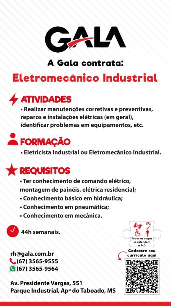 Aparecida do Taboado (MS) – Está em busca de uma oportunidade de emprego? O Costa Leste News reuniu algumas das vagas disponíveis nas indústrias Plastrela e Gala. Os interessados devem procurar as respectivas empresas através dos contatos disponibilizados nos anúncios.