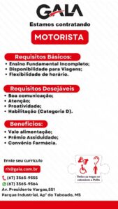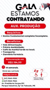 Aparecida do Taboado (MS) – Está em busca de uma oportunidade de emprego? O Costa Leste News reuniu algumas das vagas de emprego disponíveis nas indústrias Plastrela, Gala, Bello Alimentos e Probel.