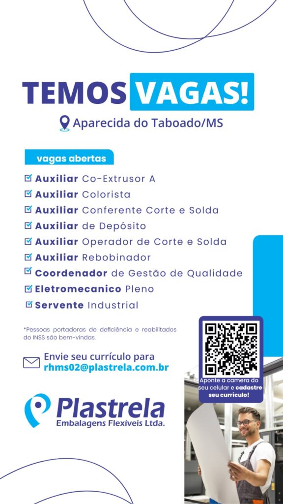 Aparecida do Taboado (MS) – Está em busca de uma oportunidade de emprego? O Costa Leste News reuniu algumas das vagas  de emprego disponíveis nas indústrias Plastrela, Gala e Bello Alimentos. Os interessados devem procurar as respectivas empresas através dos contatos disponibilizados nos anúncios.