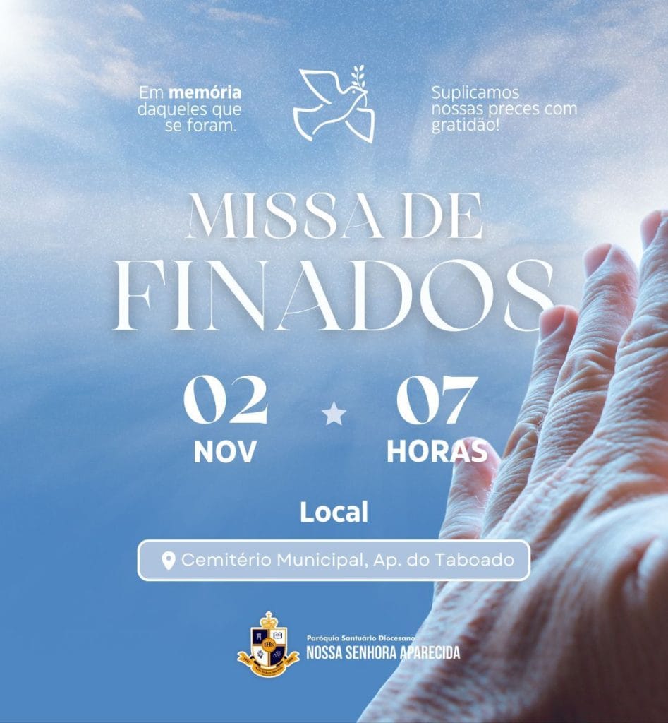 Programação Santuário Diocesano – Através das redes sociais, a Paróquia Santuário Diocesano Nossa Senhora Aparecida divulgou que realizará a tradicional missa de finados na quinta-feira (02), às 7h, no Cemitério Municipal, localizado na Av. da Saudade, Jardim Aeroporto.