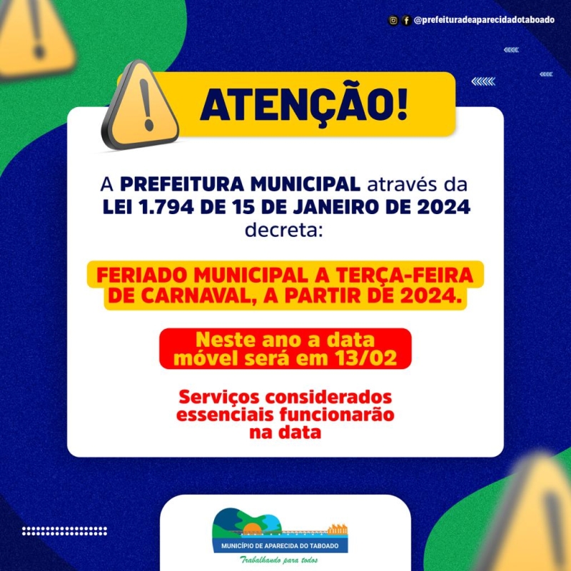 Em Aparecida do Taboado – MS, o município decretou Feriado Municipal, por esse motivo, no dia 13 de fevereiro, será feriado. Lembrando que tradicionalmente, a recomendação da Fecomércio MS é que na quarta-feira o retorno seja após o meio-dia, porém é facultativo.