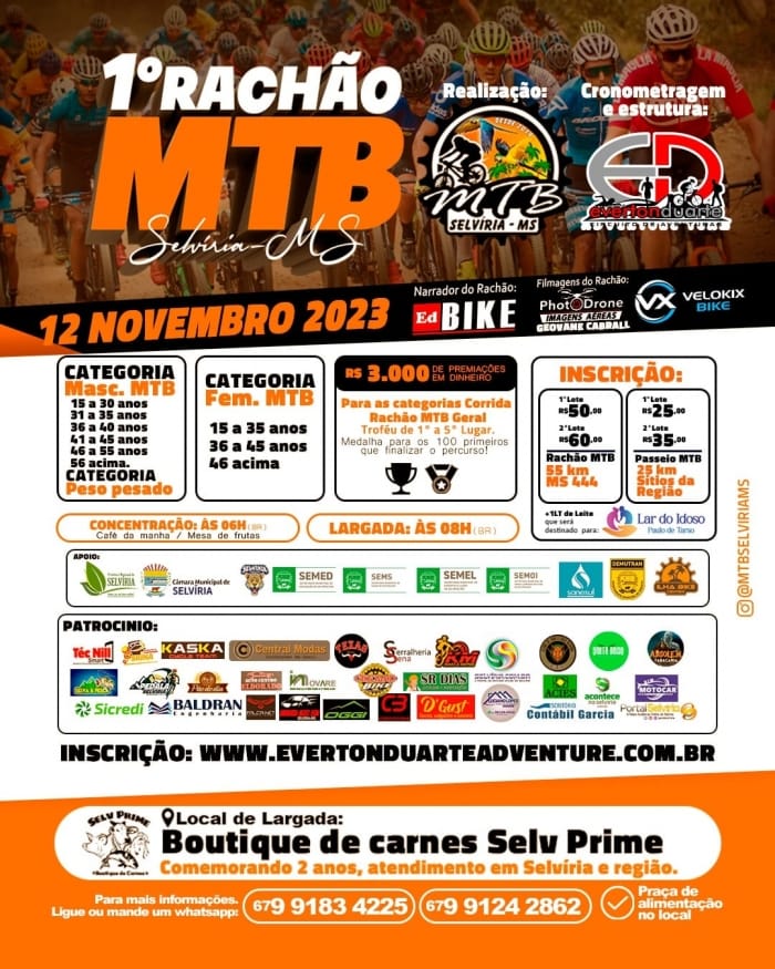 O evento terá duas modalidades, rachão (55 km – MS 444) e passeio (25 km – zona rural de Selvíria), ambas no masculino e feminino, para ciclistas com mais de 15 anos. Para a primeira, serão distribuídos R$ 3 mil em prêmios, além de troféus e medalhas.