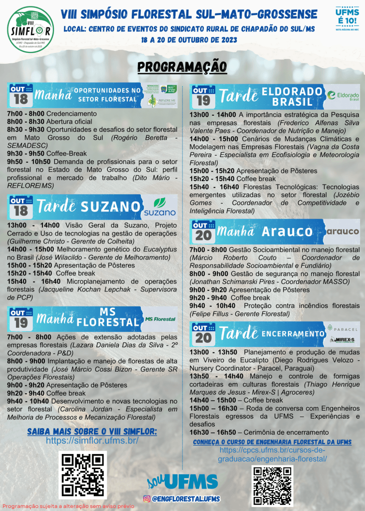 A programação completa do VIII SIMFLOR encontra-se disponível no site https://simflor.ufms.br/programacao/.