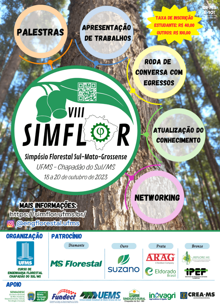 Nesse contexto, o curso de Engenharia Florestal da UFMS está organizando o VIII SIMFLOR. O evento tem como objetivo promover em Chapadão do Sul/MS um espaço de discussão e de atualização técnica-científica na área florestal, além de reunir pesquisadores, professores, profissionais, produtores rurais e estudantes interessados em debater questões relacionadas ao setor.