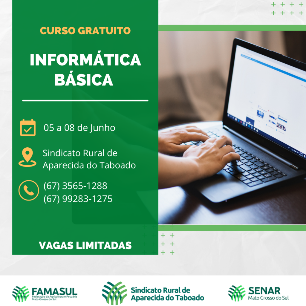 Aparecida do Taboado (MS) – Terá início nesta quarta-feira (05) o curso gratuito de Informática Básica que será realizado pelo Senar MS com apoio do Sindicato Rural.