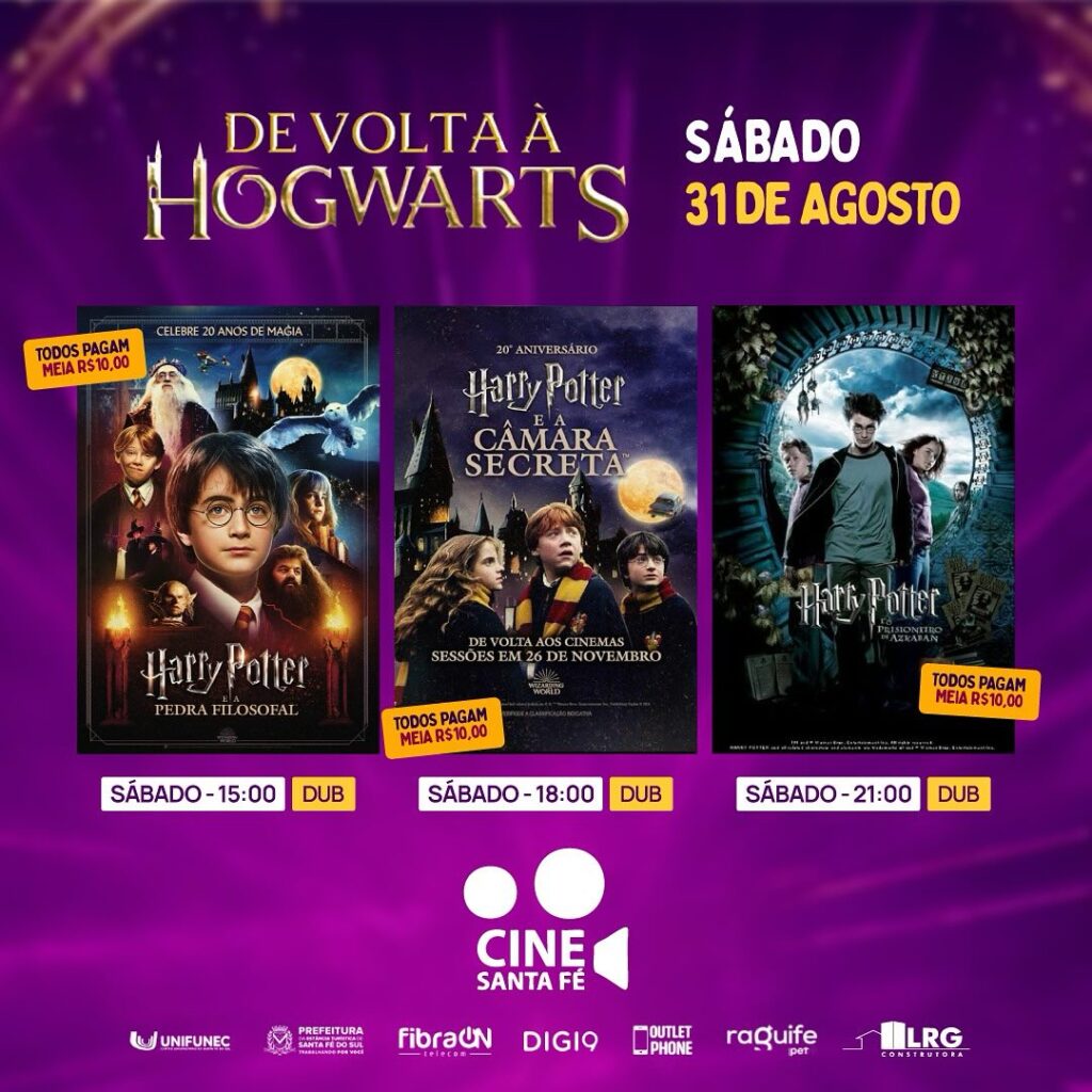 Santa Fé do Sul (SP) – Acontecerá neste sábado (31) o evento “De volta à Hogwarts” promovido pelo Cinema Santa Fé do Sul que exibirá os três primeiros filmes da saga. A maratona irá exibir os filmes Harry Potter e a Pedra Filosofal (2001), Harry Potter e a Câmara Secreta (2002) e Harry Potter e o Prisioneiro de Azkaban (2004).