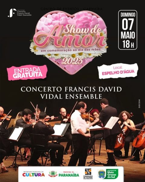 A Prefeitura de Paranaíba, através da Secretaria Municipal de Cultura, vai oferecer um concerto de Francis David Vidal Ensemble para encantar o dia das mães com a beleza da música clássica.