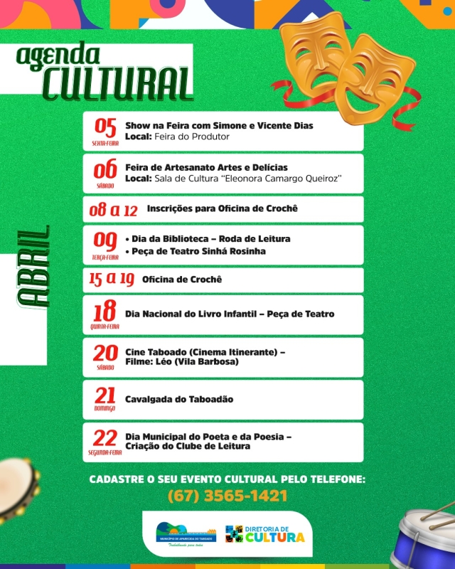 A Diretoria de Cultura de Aparecida do Taboado preparou para este mês de abril uma agenda extensa de datas comemorativas, shows, oficinas, teatro, cinema e até cavalgada.