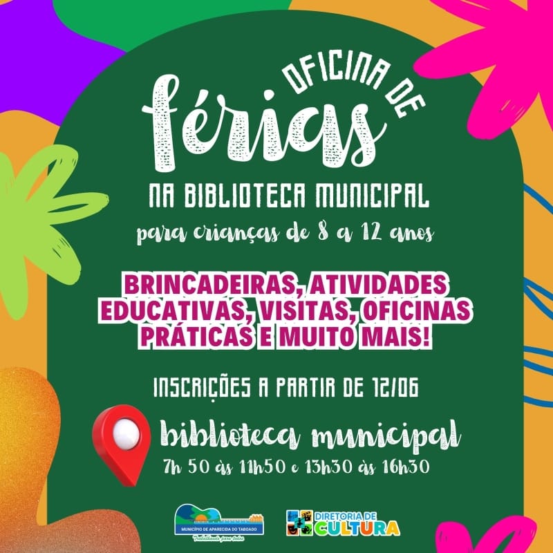 A Prefeitura Municipal através da Diretoria de Cultura realizará a partir do dia 17 de julho, para crianças de 8 a 12 anos, uma produtiva oficina de férias na Biblioteca Municipal de Aparecida do Taboado.