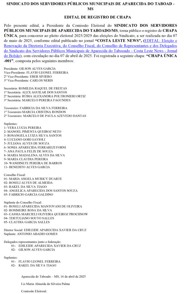 Edital: Registro de chapa Sindicato dos Servidores Públicos Municipais de Aparecida do Taboado