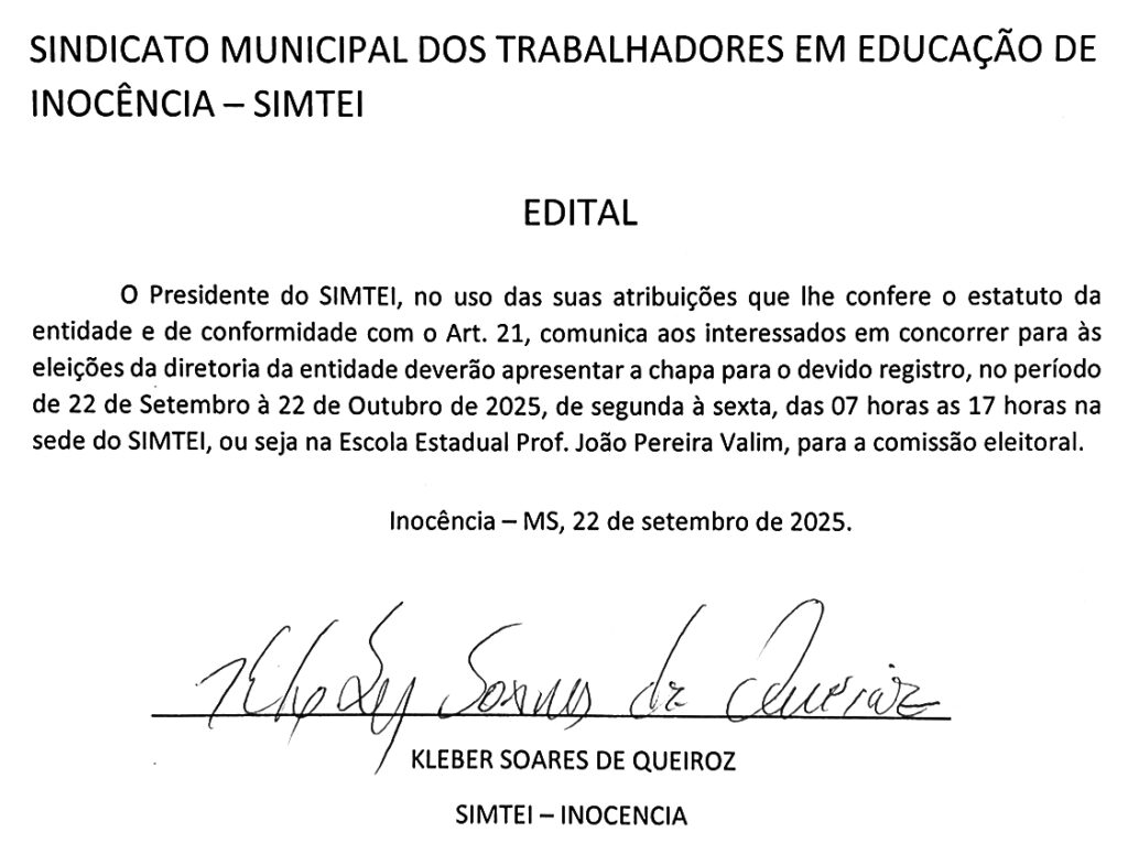 EDITAL Sindicato Municipal dos Trabalhadores em Educação de Inocência
