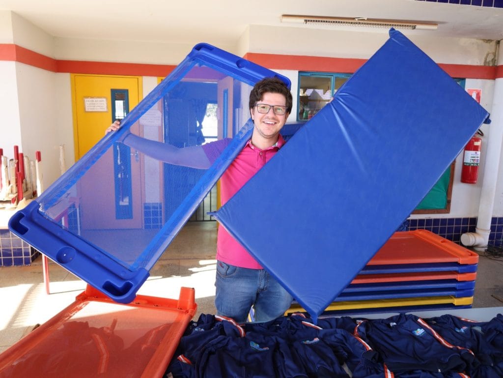 As camas empilháveis para os momentos de descanso dos alunos também foram entregues, sendo 334 caminhas que foram distribuídas entre as unidades, sendo 140 para o CMEI “Adalberton Rodrigues de Almeida”, 74 para o CMEI “Adelice Bernardes de Melo” e mais 120 para o CMEI “Rosália Queiroz de Oliveira”.