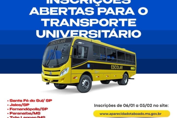 MaisA Secretaria Municipal de Educação informa que estão abertas as inscrições para o transporte universitário. Período de Inscrição: Início: 6 de janeiro Término: 3 de fevereiro de 2025 Os interessados devem realizar a inscrição exclusivamente