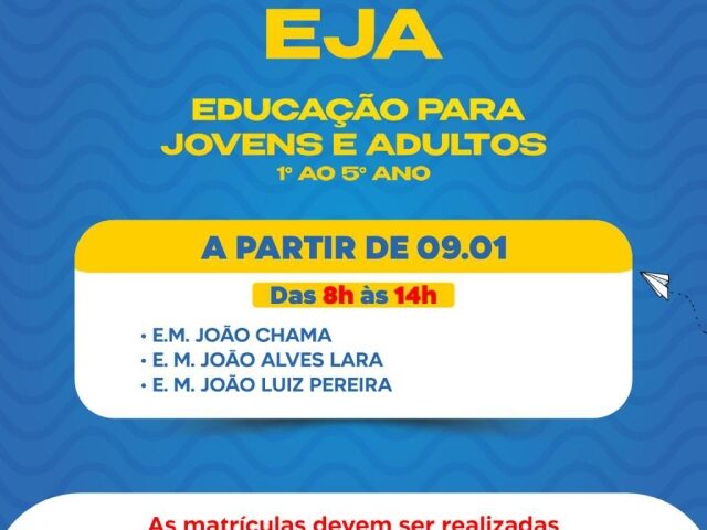 A Secretaria Municipal de Educação de Aparecida do Taboado informa que estão abertas as matrículas para a Educação de Jovens e Adultos (EJA), do 1º ao 5º ano, nas seguintes escolas municipais: