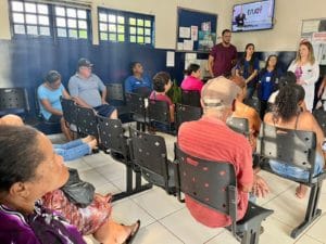 Os encontros acontecem mensalmente, envolvendo a participação da equipe multiprofissional, entre eles, nutricionista, enfermeiro, agentes de saúde, técnicos e médico da ESF, entre outros.