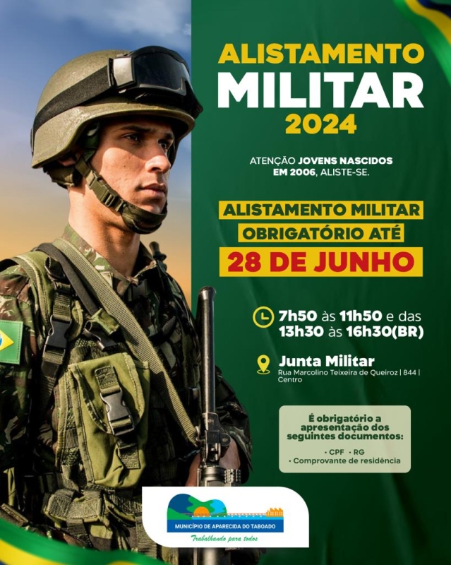 A Junta do Serviço Militar de Aparecida do Taboado comunica que o período de alistamento para o Exercício de 2024 está oficialmente aberto para os jovens nascidos em 2006, que completam 18 anos durante o ano de 2024. O prazo para alistamento se estende até o dia 28 de junho.