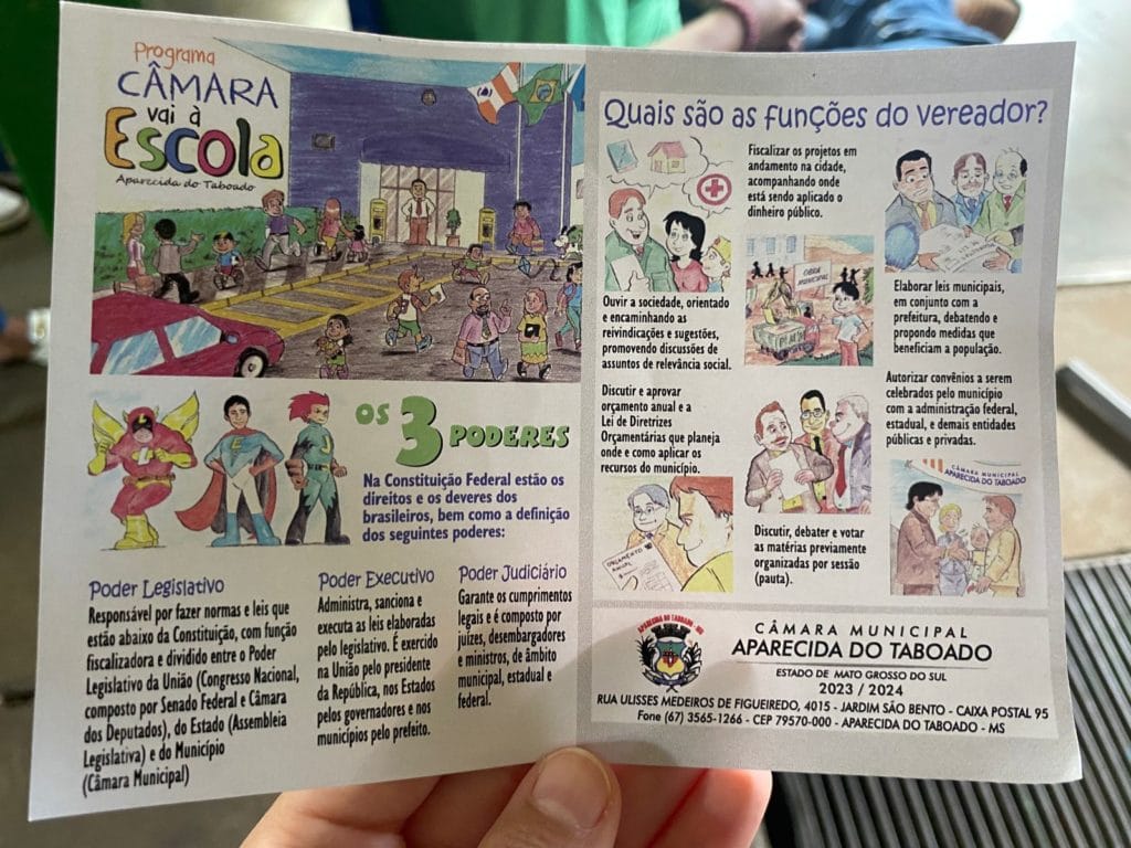Aparecida do Taboado (MS) – Na manhã desta terça-feira (19), foi realizado o primeiro encontro do projeto “Câmara Vai À Escola”, na Escola Estadual Georgina de Oliveira Rocha. O programa que já foi feito em outros municípios, agora está presente em Aparecida do Taboado, através da iniciativa do vereador e atual presidente da câmara, Jucleber Bim.