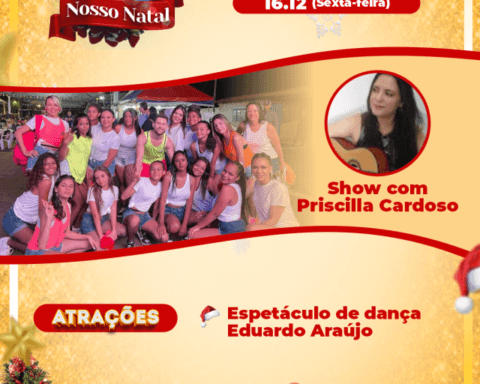 MaisO Nosso Natal 2022 na noite desta sexta-feira (16) contará com a apresentação do Espetáculo Eduardo Araújo e grupo de dança, além de um brilhante show com Priscilla Cardoso.