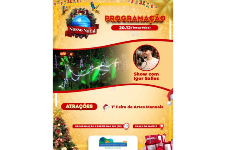 MaisO Nosso Natal 2022 na noite desta terça-feira (20) contará com a 1.ª Feira de Artes Manuais e show com Igor Salles.