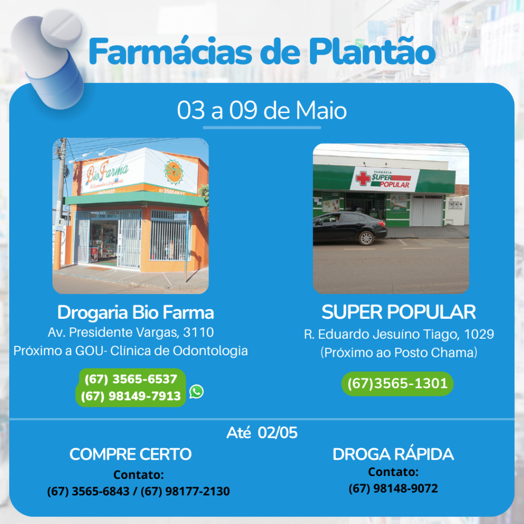 Farmácia de Plantão em Aparecida do Taboado (03 a 09 de Maio)