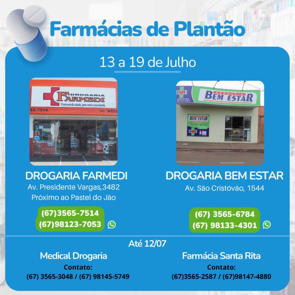 Farmácia de Plantão em Aparecida do Taboado (13 a 19 de Julho)