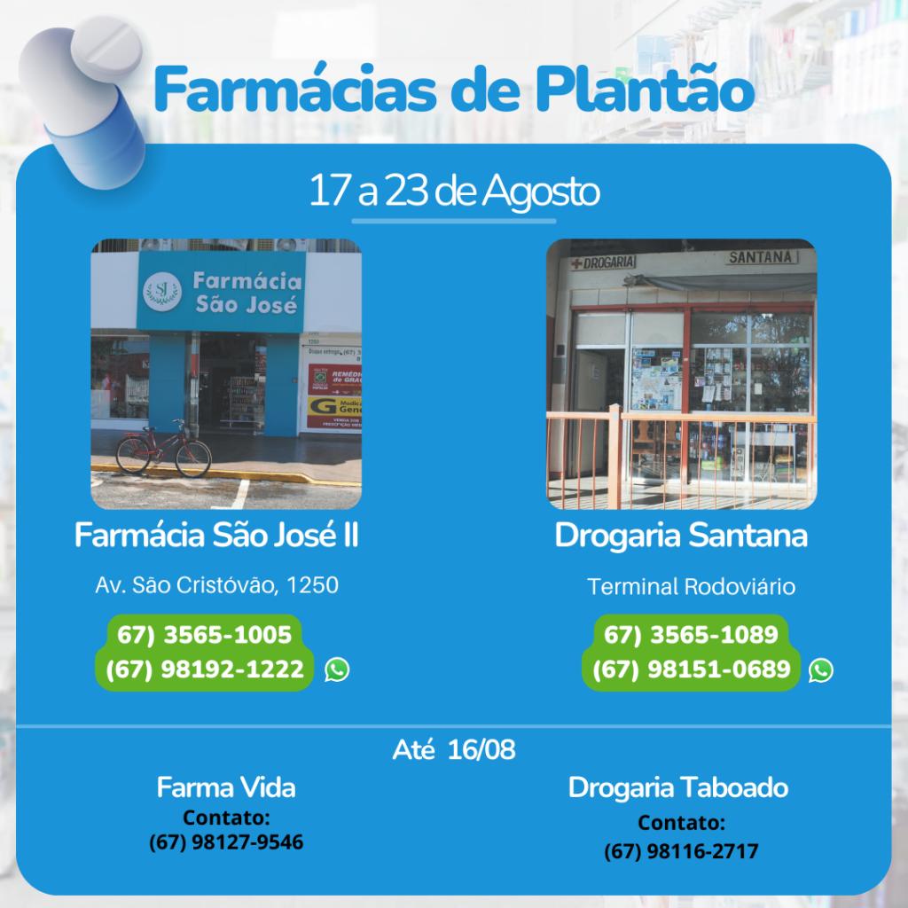 Farmácia de Plantão em Aparecida do Taboado (17 a 23 de Agosto)