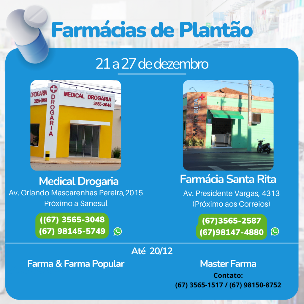 Confira as farmácias de plantão em Aparecida do Taboado entre dos dias 21 a 27 de dezembro: