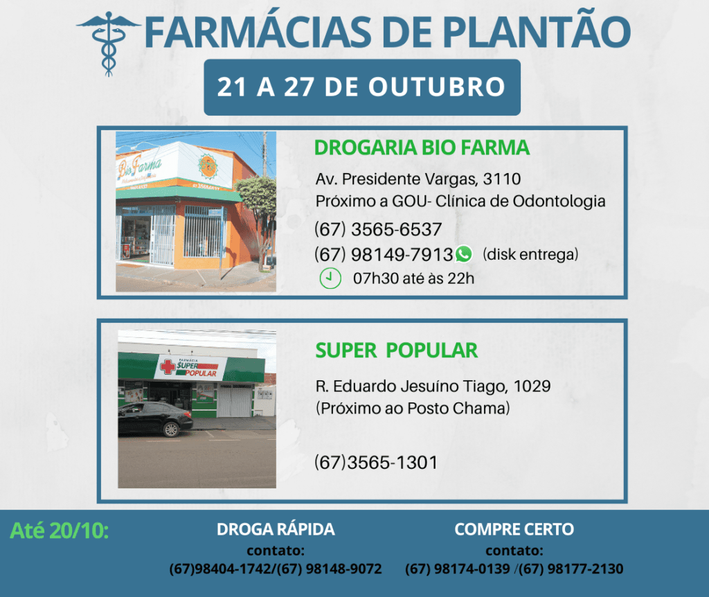 Farmácia de Plantão em Aparecida do Taboado (21 a 27 de Outubro)