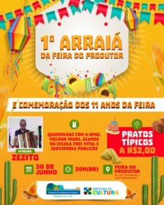 Em comemoração aos 11 anos da Feira do Produtor “Augusto Carvalho”, a diretoria de Cultura, que tem à frente Francielen Stein, estará promovendo no dia 30 de junho, sexta-feira, o “1º Arraiá da Feira do Produtor”.