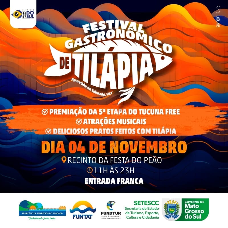 Sendo uma realização conjunta entre Governo Municipal, Fundação de Turismo de Aparecida do Taboado, Fundação de Turismo de Mato Grosso do Sul, Secretaria de Estado de Turismo, Esporte, Cultura e Cidadania e Governo do Estado de Mato Grosso do Sul, no dia 4 de novembro, os amantes da boa comida e da música terão a oportunidade de experimentar uma das iguarias mais apreciadas na região: a tilápia. O recinto da Festa do Peão se transformará em um centro gastronômico, com as festividades ocorrendo das 11h às 23h e, o melhor de tudo, com entrada franca.
