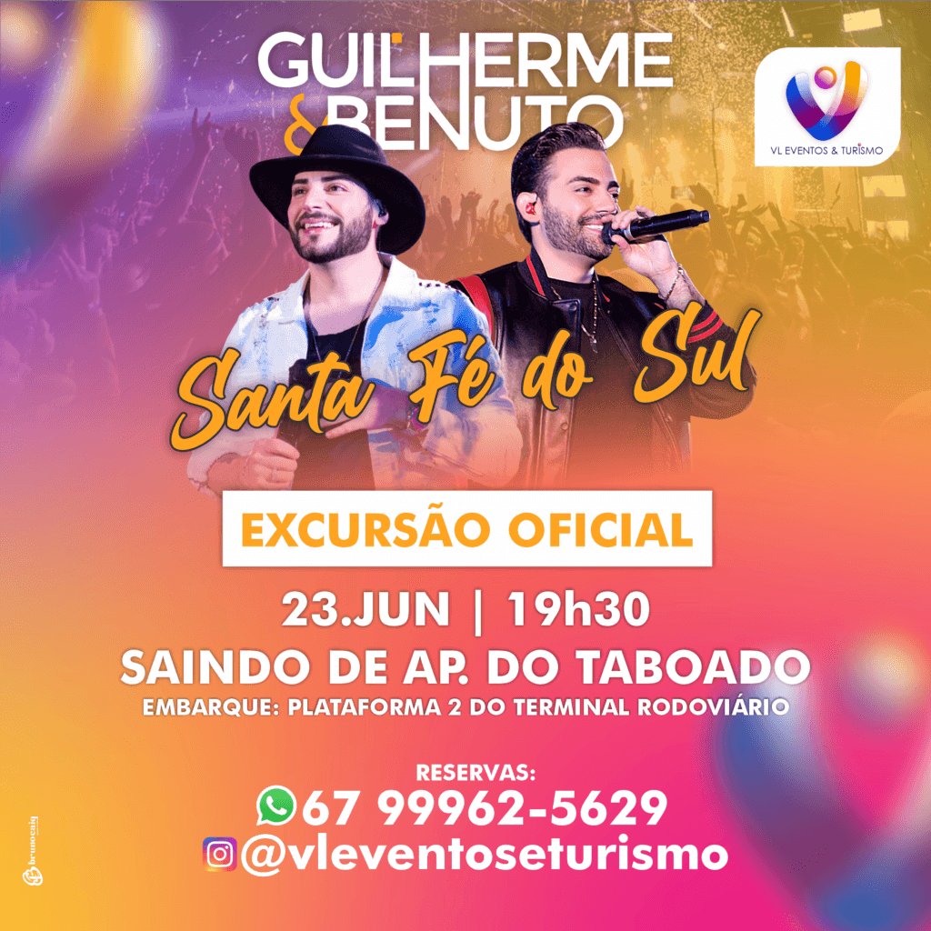 Aparecida do Taboado (MS) – A empresa VL Eventos & Turismo promoverá nesta sexta-feira (23) uma excursão para a FICCAP em Santa Fé do Sul, que terá como atração principal a dupla Guilherme & Benuto. O transporte sairá do terminal rodoviário às 19h30.