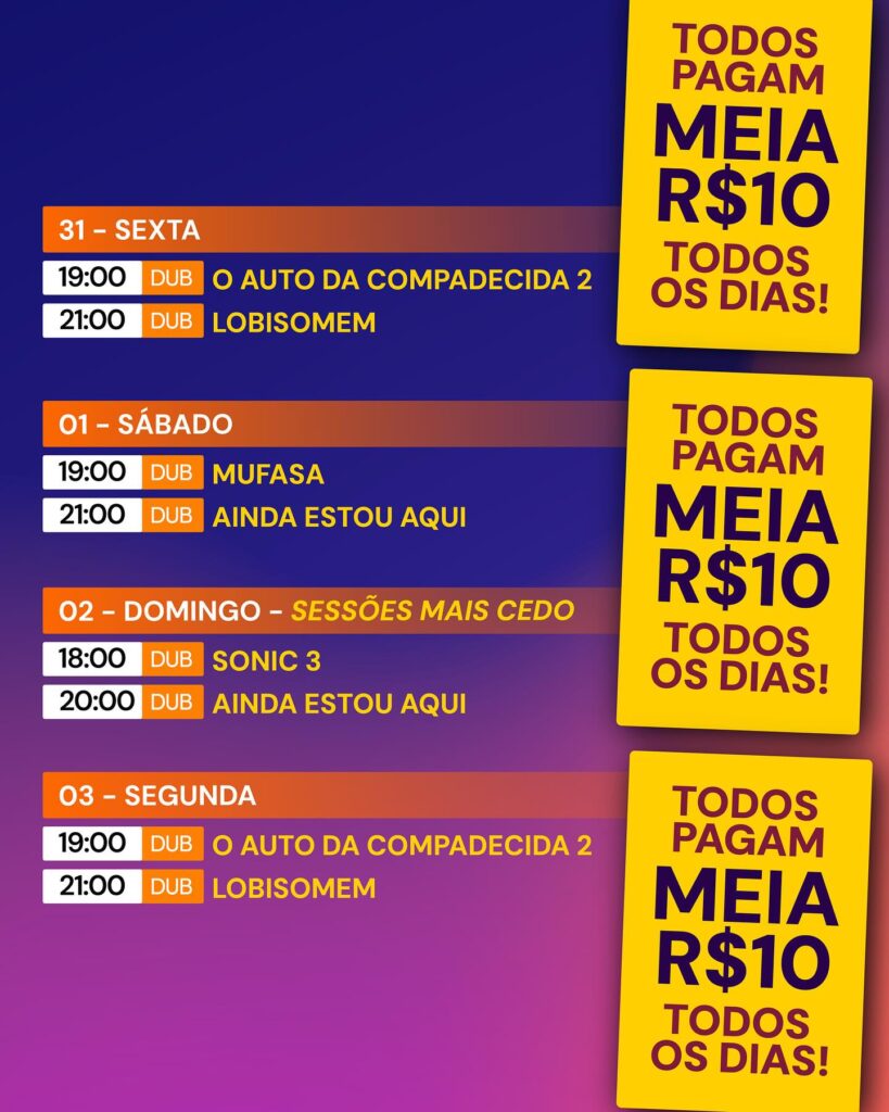 O filme brasileiro ‘Ainda Estou Aqui’, estrelado por Fernanda Torres e dirigido por Walter Salles, terá novas sessões para quem ainda não conseguiu prestigiar a produção. Durante o fim de semana, os espectadores também poderão escolher entre os filmes Lobisomem, O Auto da Compadecida 2, Sonic 3 e Mufasa.
