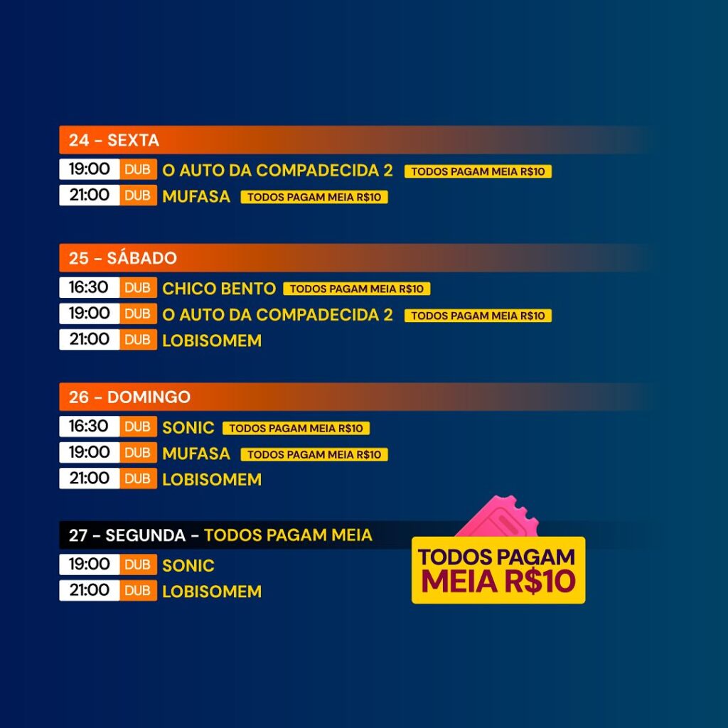 Neste final de semana, moradores da cidade e região poderão escolher entre o filme estreante e também outras quatro opções que terão valor especial nos ingressos que serão vendidos por R$10,00, sendo o Auto da Compadecida 2, Sonic 3, Mufasa e Chico Bento.