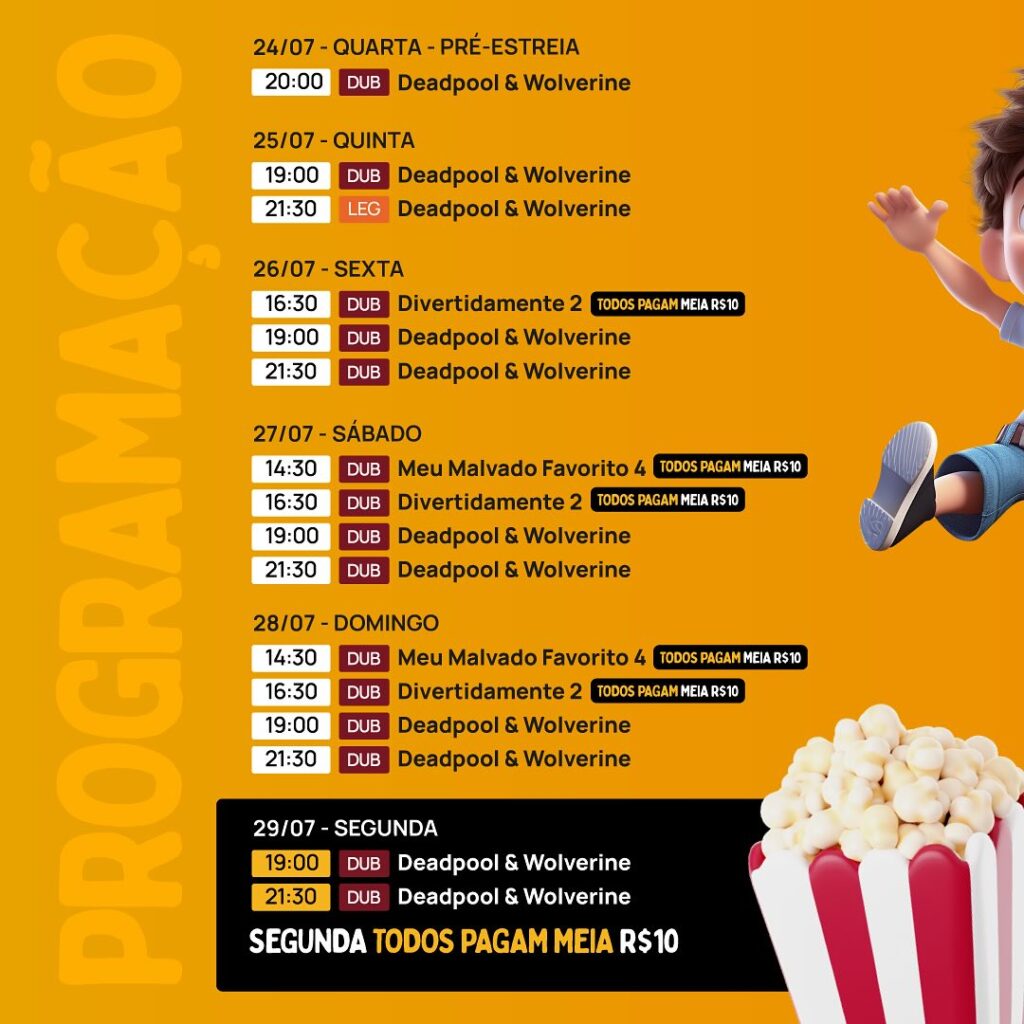 Além do filme de estreia, as sessões dos filmes Divertida Mente 2 e Meu Malvado Favorito 4 terão preço especial em todas as sessões e os ingressos serão vendidos por R$10,00.