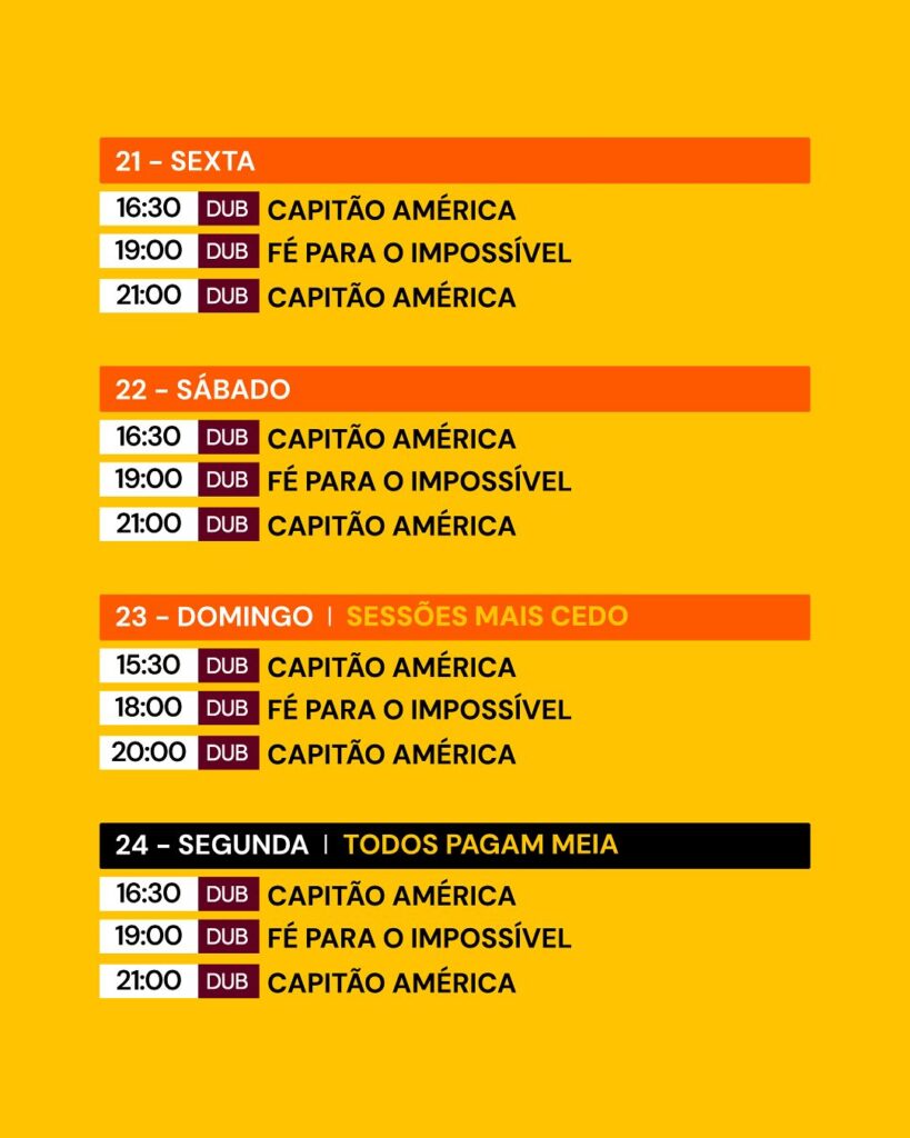 Até a próxima segunda-feira (24), o Cinema Santa Fé do Sul exibirá dois filmes: Capitão América: Admirável Mundo Novo, da Marvel Studios, e a estreia da semana, Fé para o Impossível.