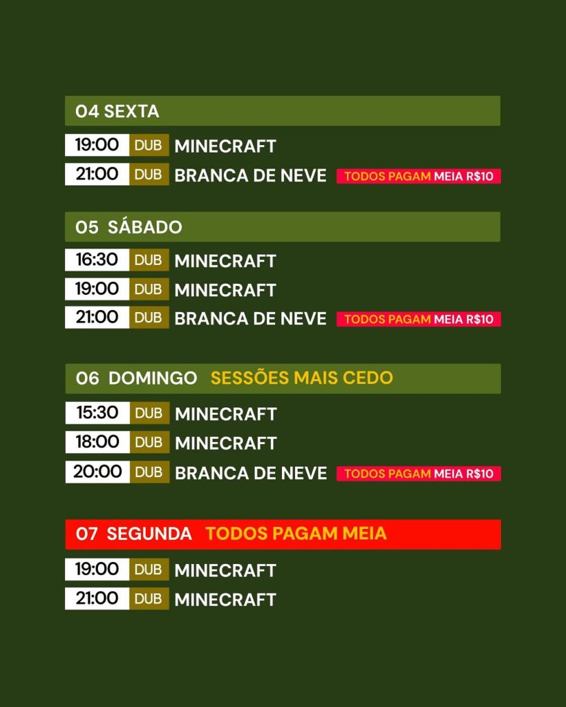A programação do Cinema Santa Fé do Sul já foi divulgada. Entre os dias 4 e 7 de abril, dois filmes estarão em cartaz. ‘Branca de Neve’ seguirá em exibição, com ingressos a R$ 10 em todas as sessões e a novidade da semana é ‘Minecraft’
