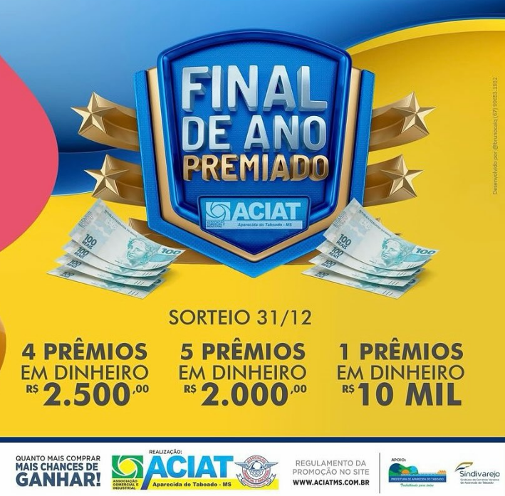 Aparecida do Taboado (MS) – O sorteio da promoção Final de Ano Premiado promovido pela Associação Comercial (ACIAT) com apoio da Prefeitura Municipal e Sindivarejo será realizado no dia 31 de dezembro. Serão sorteados vários prêmios em dinheiro que totalizam R$ 30 mil.