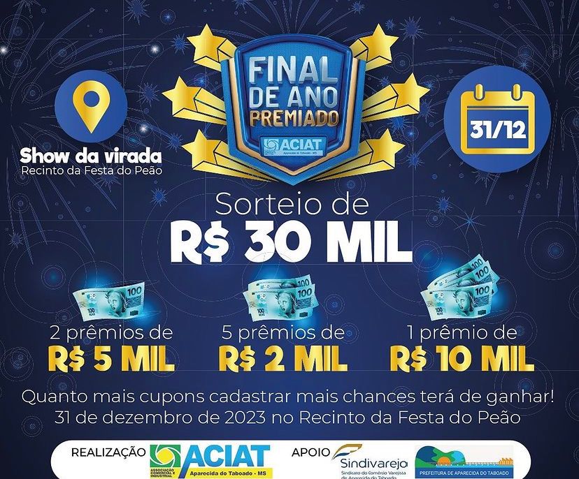 Aparecida do Taboado (MS) – Acontecerá neste domingo (31) o sorteio da promoção Final de Ano Premiado que irá sortear 2 prêmios no valor de 5 mil reais, 5 prêmios de 2 mil reais e 1 de 10 mil reais, totalizando 30 mil reais. Até o momento, 134.081 números foram entregues e 2.754 foram cadastrados.
