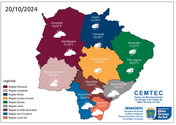 Para as regiões pantaneiras e sudoeste as mínimas serão entre 23-25°C e máximas de 29-34°C. No bolsão e norte ficam de 21-24°C (mínimas) e 27-34°C (máximas). Já na Capital a máxima poderá chegar a 30°C e mínima de 20°C.