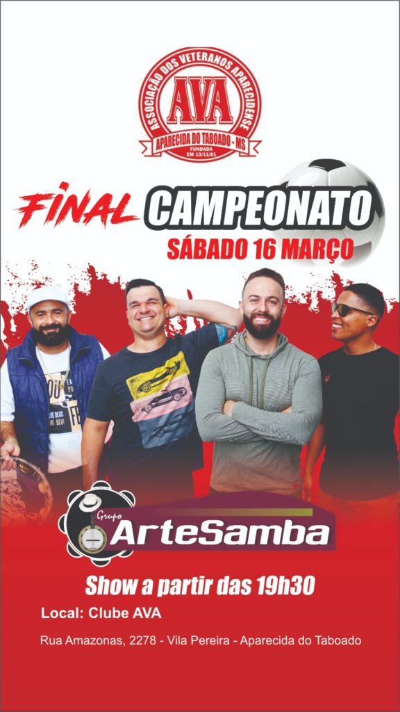 Aparecida do Taboado (MS)– Ocorrerá neste sábado (16) a partir das 17h na Associação dos Veteranos Aparecidenses (AVA), a fase final do Campeonato de Futebol Categoria Livre que teve início com a participação de 8 equipes. Para encerrar o campeonato, haverá show com o Grupo ArteSamba, a partir das 19h30.