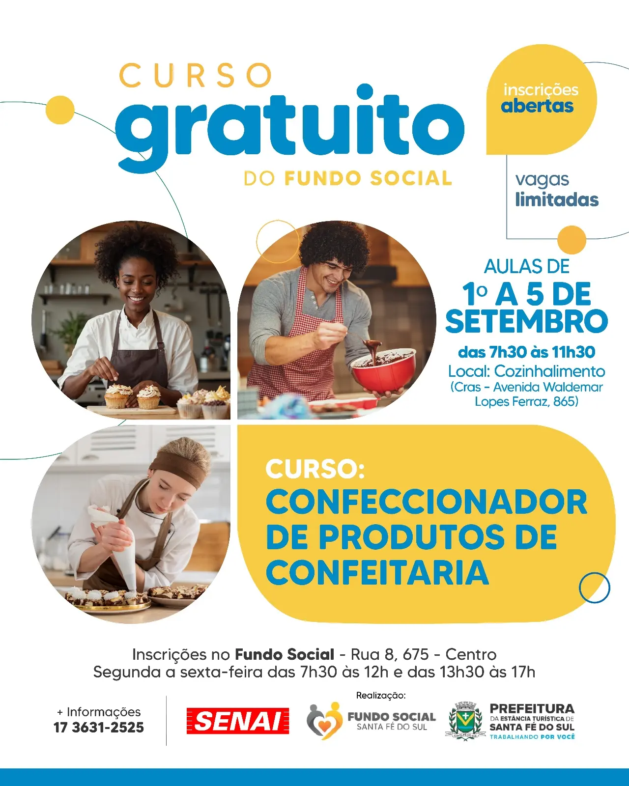 O Fundo Social de Solidariedadeda Estância Turística de Santa Fé do Sul está com inscrições abertas para o curso gratuito de Confeccionador de Produtos de Confeitaria, em parceria com o SENAI.