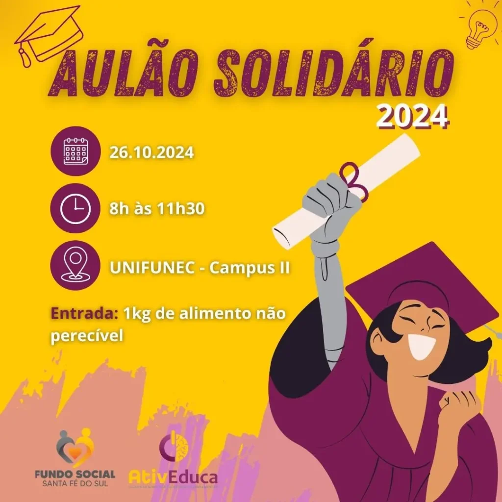O Fundo Social de Solidariedadeda Estância Turística de Santa Fé do Sul em parceria com a AtivEduca – Escola de Robótica e Educação Complementar realizarão um Aulão Solidário – Preparativo para o Enem 2024. A aula acontece no sábado, 26 de outubro, das 8h às 11h30, no Unifunec Campus II.