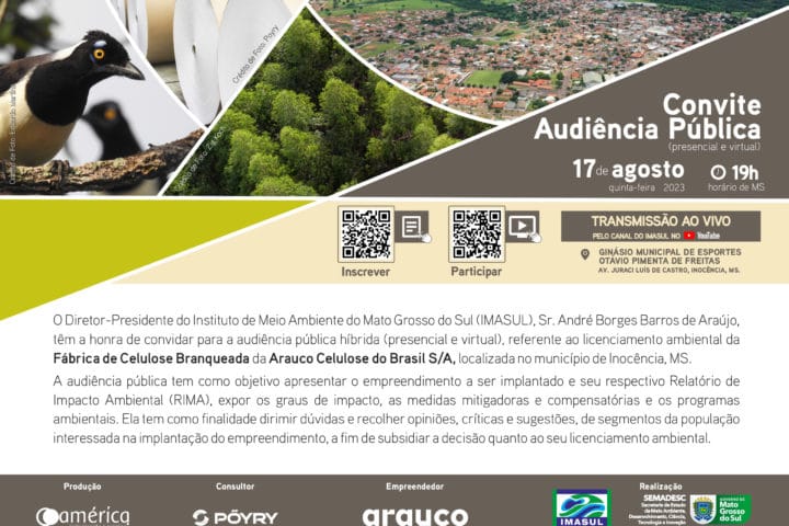 MaisEDITAL DE CONVOCAÇÃO DE AUDIÊNCIA PÚBLICA O Diretor-Presidente do IMASUL, nos termos das Resoluções CONAMA 009/87 e SEMA/MS 004/89, e da Portaria IMASUL n.812, de 29 de setembro de 2020 convoca os