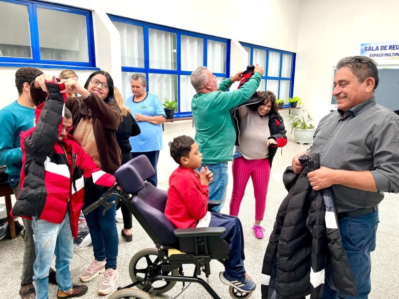 O momento foi marcado pela entrega de 65 agasalhos do tipo moletom aos alunos atendidos pela APAE. As peças foram doadas pela Receita Federal, oriundas de apreensões realizadas em operações alfandegárias, e agora ganham novo destino alunos atendidos pela instituição.