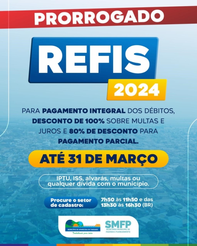 O Governo Municipal de Aparecida do Taboado anunciou a prorrogação do REFIS 2024, oferecendo condições facilitadas para a regularização de débitos. Os contribuintes que optarem pelo pagamento integral das dívidas terão 100% de desconto sobre multas e juros. Já para quem optar pelo pagamento parcial, o desconto será de 80%.