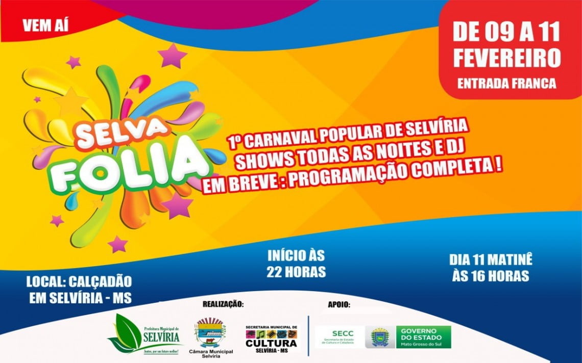 Esta é mais uma realização da Prefeitura Municipal de Selvíria, Secretaria de Cultura, Secretaria de Saúde e Câmara Municipal com apoio da Secretaria de Estado de Cultura e Cidadania. Prestigie!